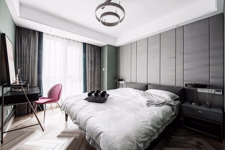 卧室,黑灰色和墨绿的搭配很是好看,床头硬包代替高床背,让空间显得空旷又时尚。黑色的梳妆台,粉色的椅子,人字拼地板,让空间质感满满。
