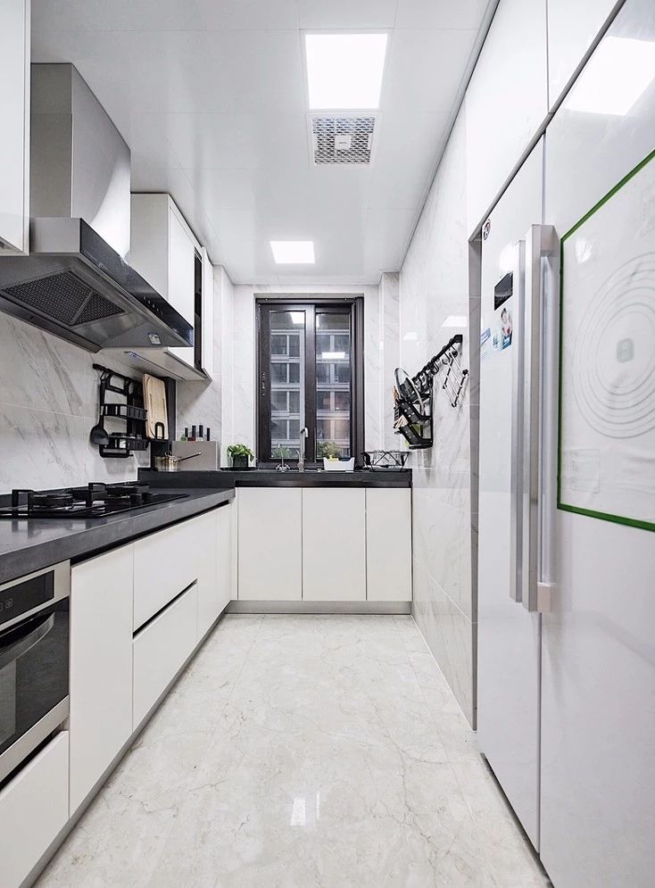 厨房是比较狭长的L型布局,所以选择以浅色系类型的瓷砖来装饰厨房,橱柜门也是白色为主,清爽又时尚。