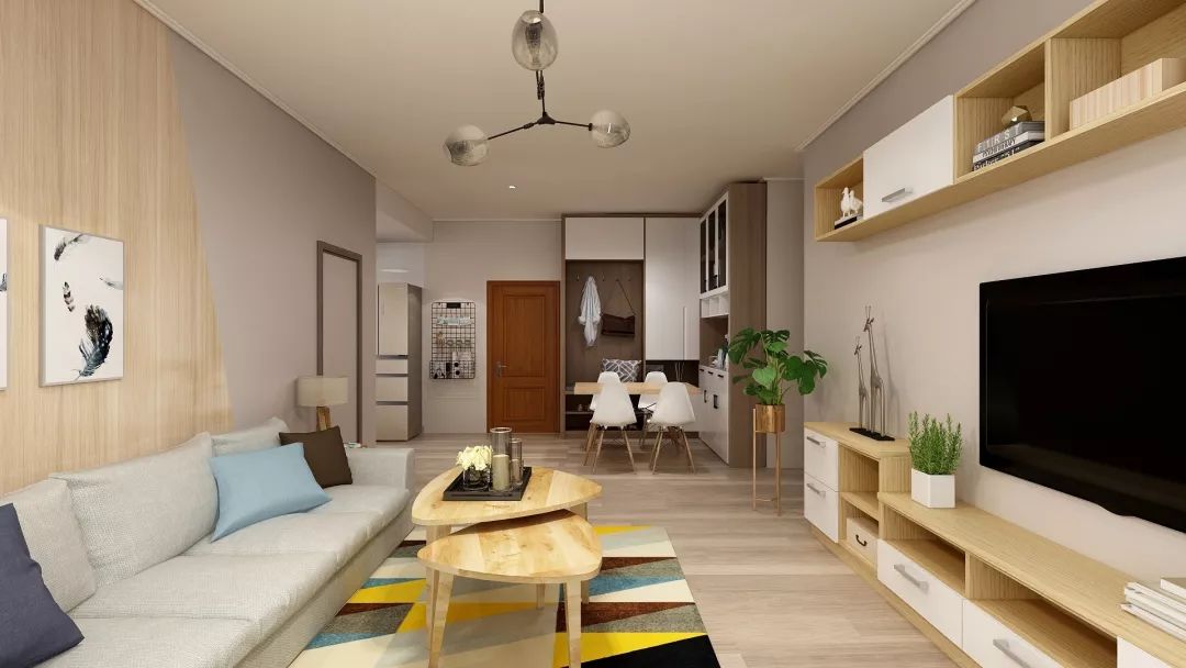 客厅不管是家具的摆设,还是物品的装饰都着重强调其呈现出层次感,原木色搭配白色电视柜、灰色布艺沙发、亮色几何形地毯,即便是融合了这么多装修风格的设计元素,却依旧显得美观而不杂乱。