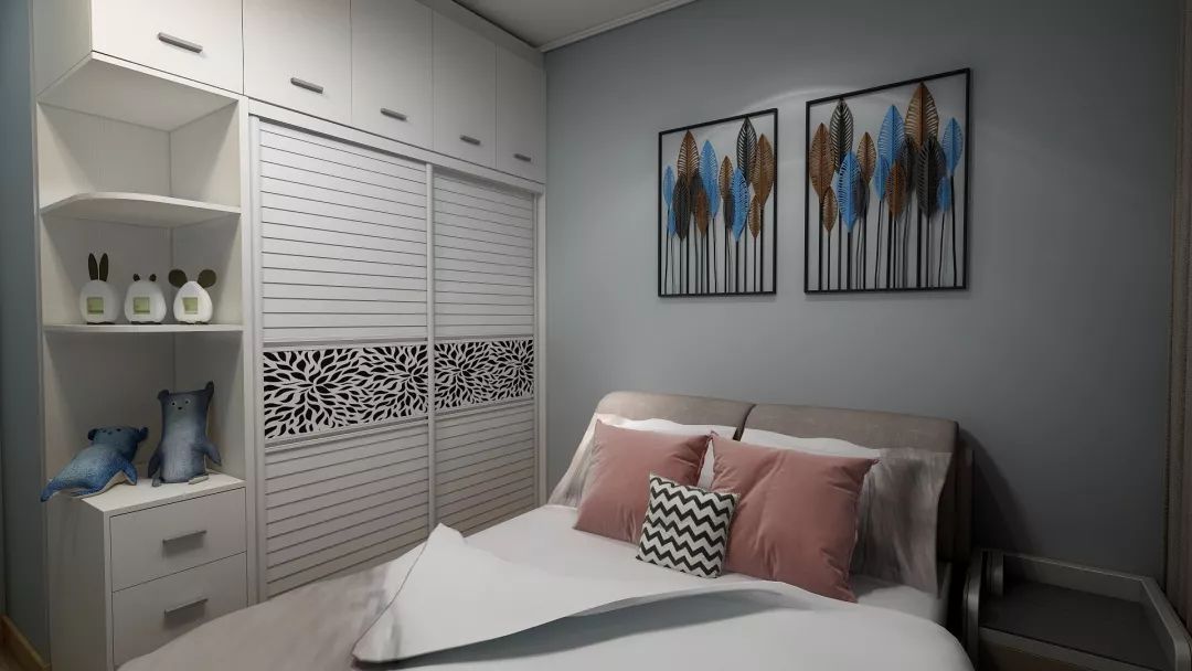 卧室中的色彩运用符合人们对现代生活的审美需求,白色推拉门大衣柜,床头背景墙简约时尚的装饰画,整体设计简单朴素,却释放着低调的气质品味,高级的灰色寄托着家的温暖。