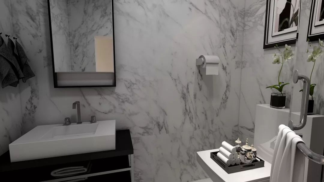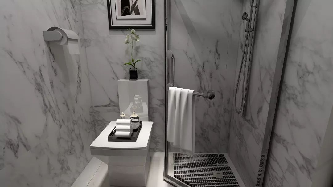 通过装饰画、地面材料,装饰品甚至光线的变化来表达不同功能空间的划分,而且这种划分又随着不同的时间段表现出兼容性和流动性。把整个卫生间经过减法和加法的手法分割成动静分离的区域,布局工整和谐,动静相宜。