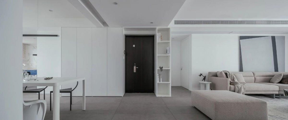 入户通过两侧增加收纳柜满足鞋子的收纳需求,定制柜的设计也有效的避免了入户对室内空间的一览无余,简约时尚,从进门就践行简约主题。