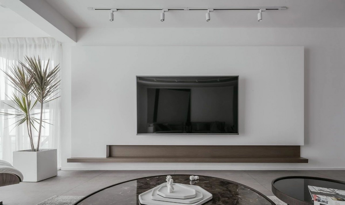 电视背景墙木色与白色搭配,赋予空间一种安静、舒适的感觉。