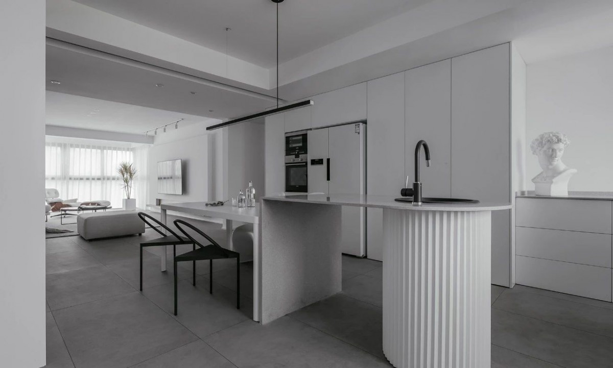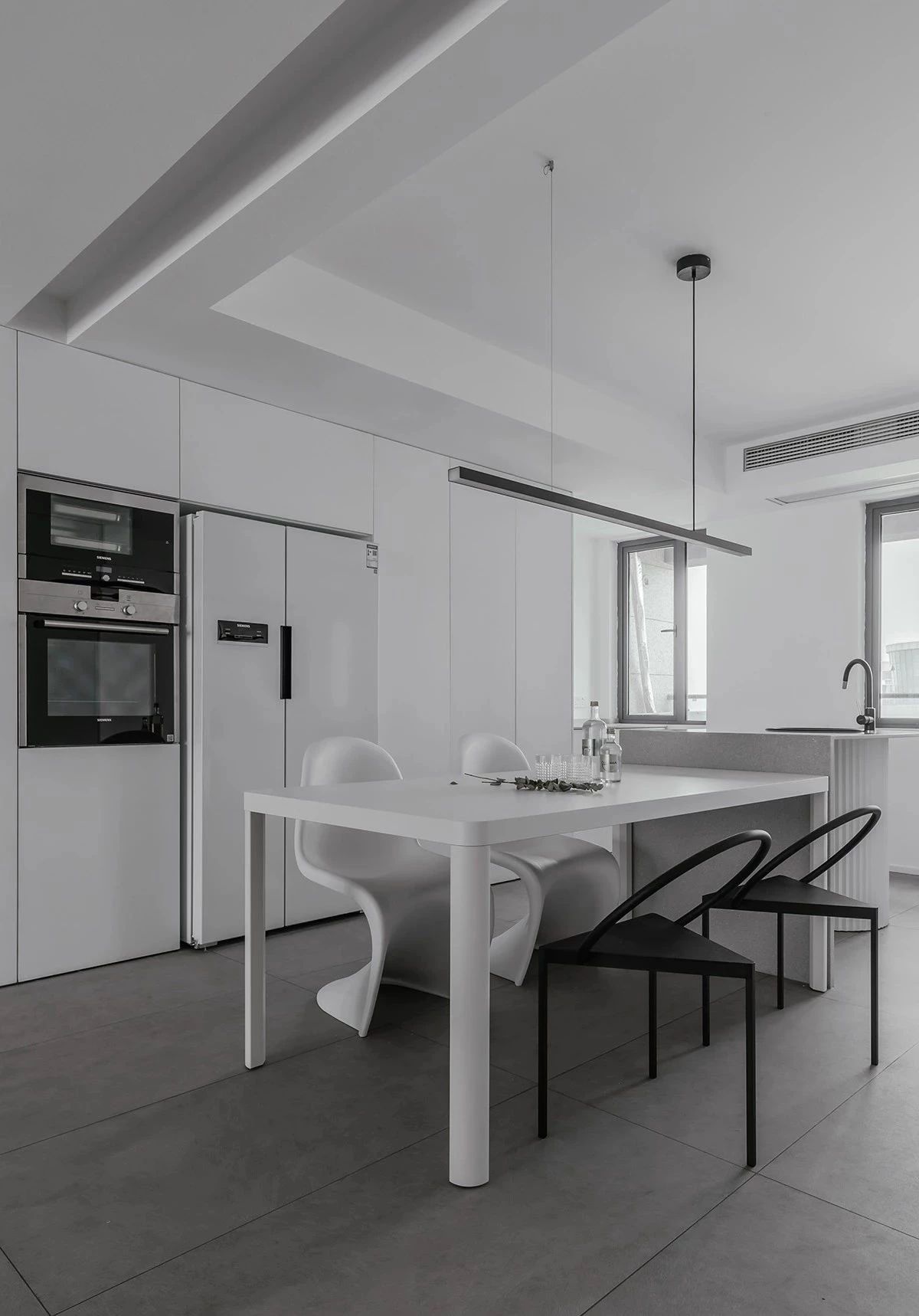 厨房与餐厅一体设计,灰色的岛台,白色的餐桌线条简单,顶部设计灯带,弱化原来梁体让其空间轻松。纯白餐桌搭配f r a m a钢制三角餐椅及白色h i m-h e r餐椅,打造黑白空间的平衡世界。