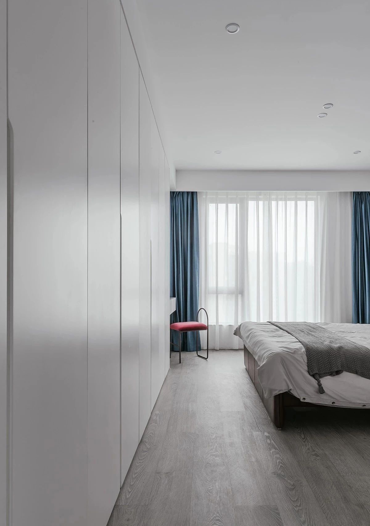 主卧做了一整面衣柜,暗藏把手的设计让过道更洁净。