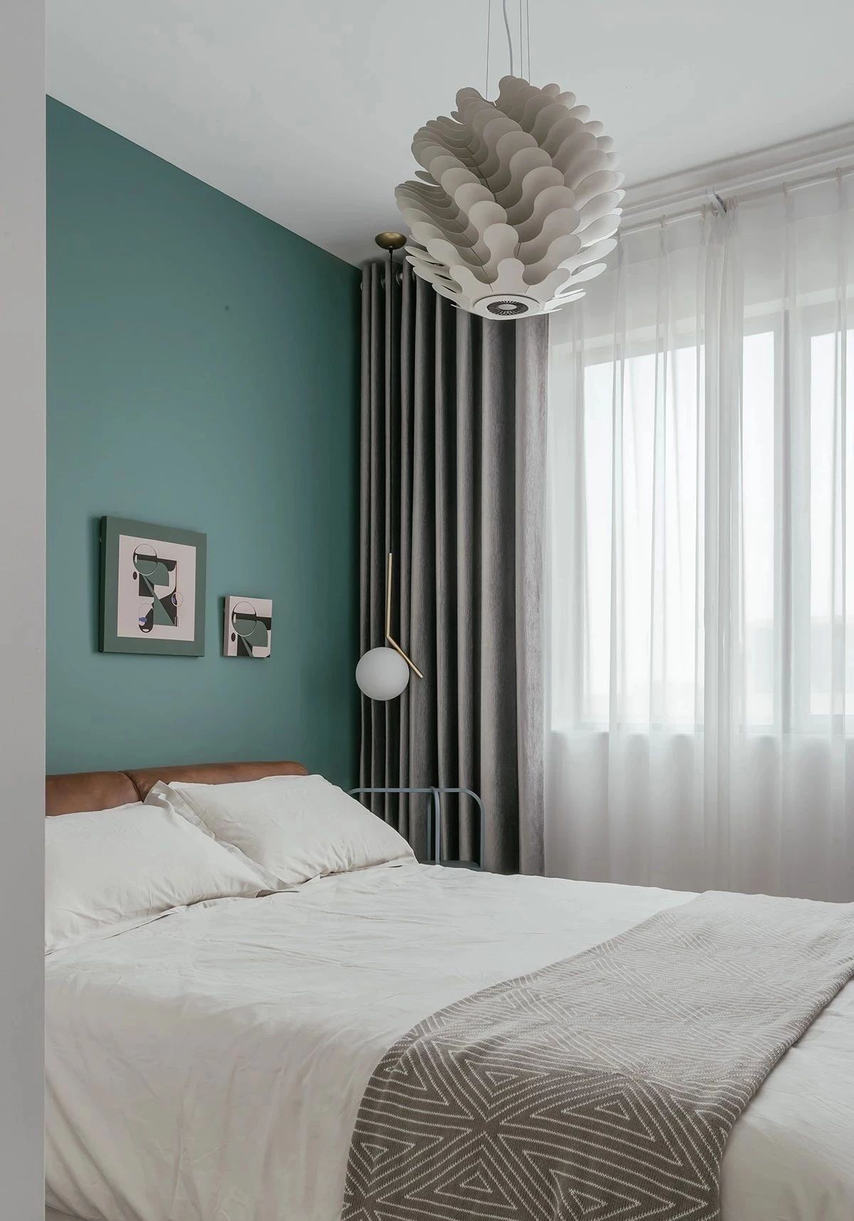 以海洋绿作为次卧床头背景墙主色调,配上灰色窗帘,优雅静谧。相同色相的装饰画,螺旋式吊灯,让居住者感觉自由和洒脱,赋予生活舒适感。