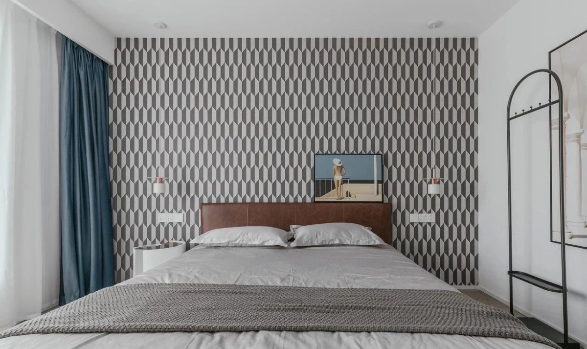 木色的地板,波普纹理的背景墙,灰白色的床品,搭配挂衣架及装饰画,整个空间色彩搭配温柔之余,尽显简洁雅致的调性。