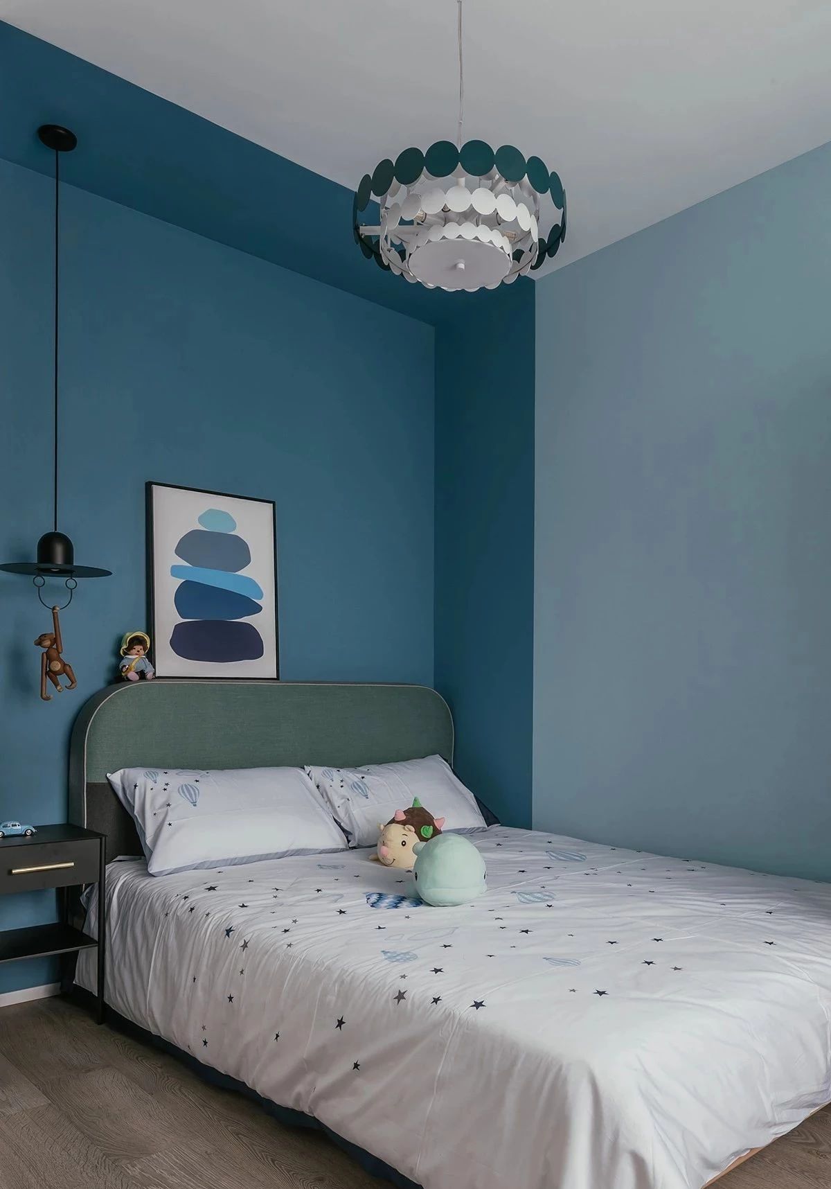 儿童房的设计,趋向于孩子拥有更多的活动空间,床边趣味性猴子小吊灯,与靛蓝和土耳其蓝的结合增加睡眠的静谧感。