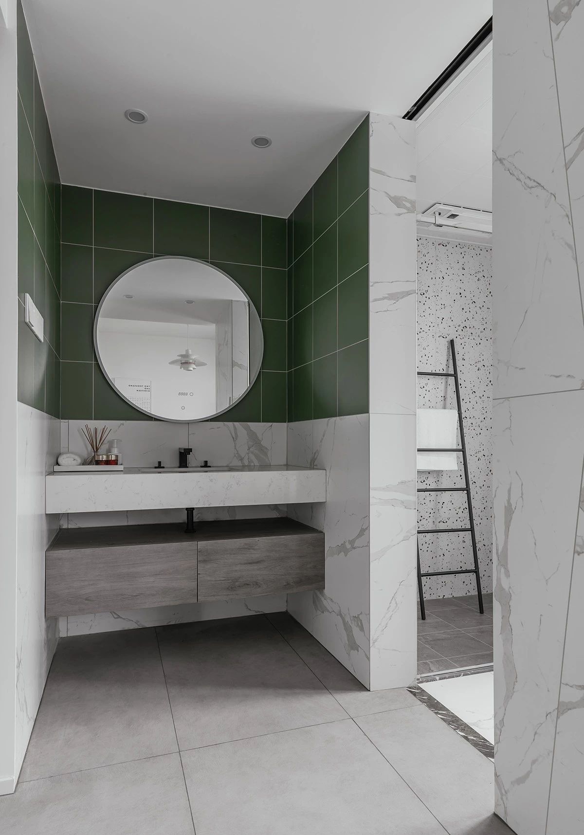 卫生间干湿分离设计,瓷砖选用海王绿搭配爵士白,悬挂式洗浴盆,带入现代都市精致感的氛围。