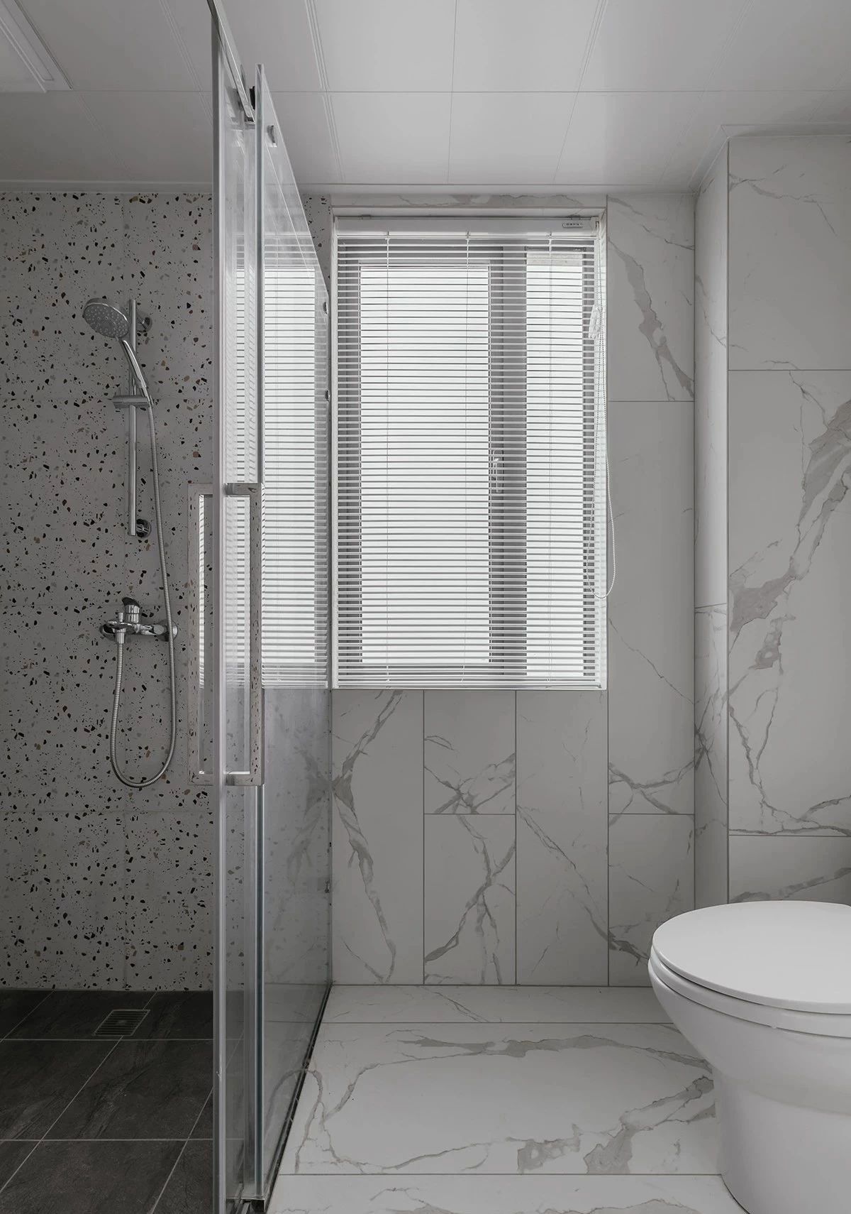 沐浴区,是白色的大理石纹墙地砖的结合,另一面是水磨石的形式,使空间艺术与层次感并行。