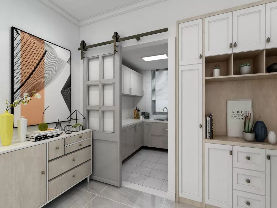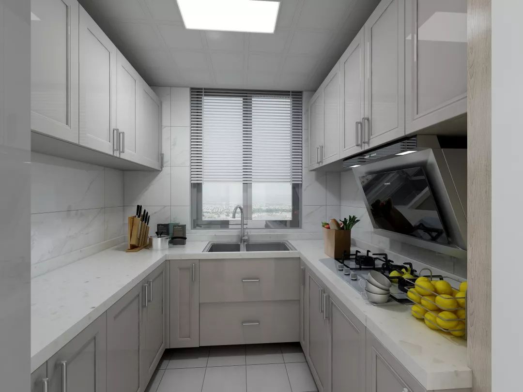 厨房白色操作台面、灰色地砖、白色集成吊顶天花板,衬托得窗户与浅灰色灶台外地时尚大气,业主做饭都拥有了好心情,在光线的照射下显得特别的明媚舒适。