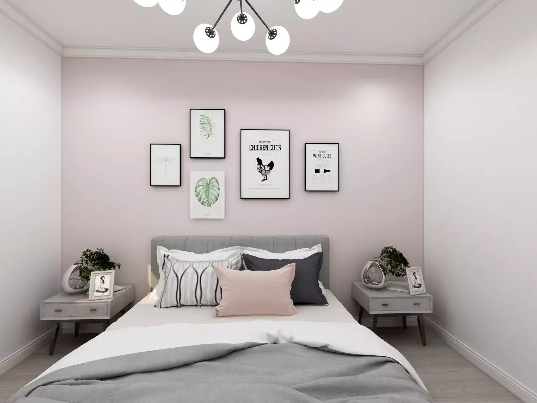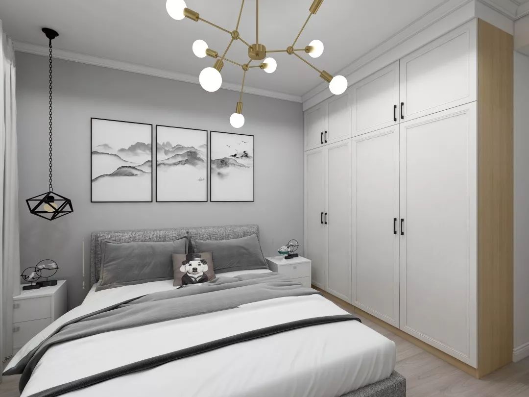 主卧的顶面和墙面都使用了单一的纯色为背景,挂上几幅水墨装饰画,黑色的北欧风床头吊灯,从外面的喧嚣回归宁静,心灵也找到了港湾。色彩搭配中体现出浓郁的北欧风情,给人带来一种返璞归真的自然气息。