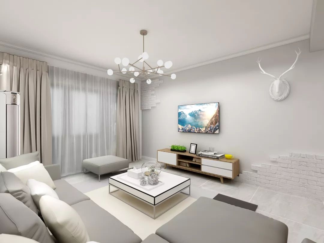 客厅以灰白色为主,大型窗户,不仅光线良好,客厅内的通风效果也很佳。电视背景墙左上方采用了白色仿古砖造型,右边羚羊头装饰物,代表着业主家吉祥的寓意,同时使人心情平静,显得客厅温馨干净、质朴优雅。