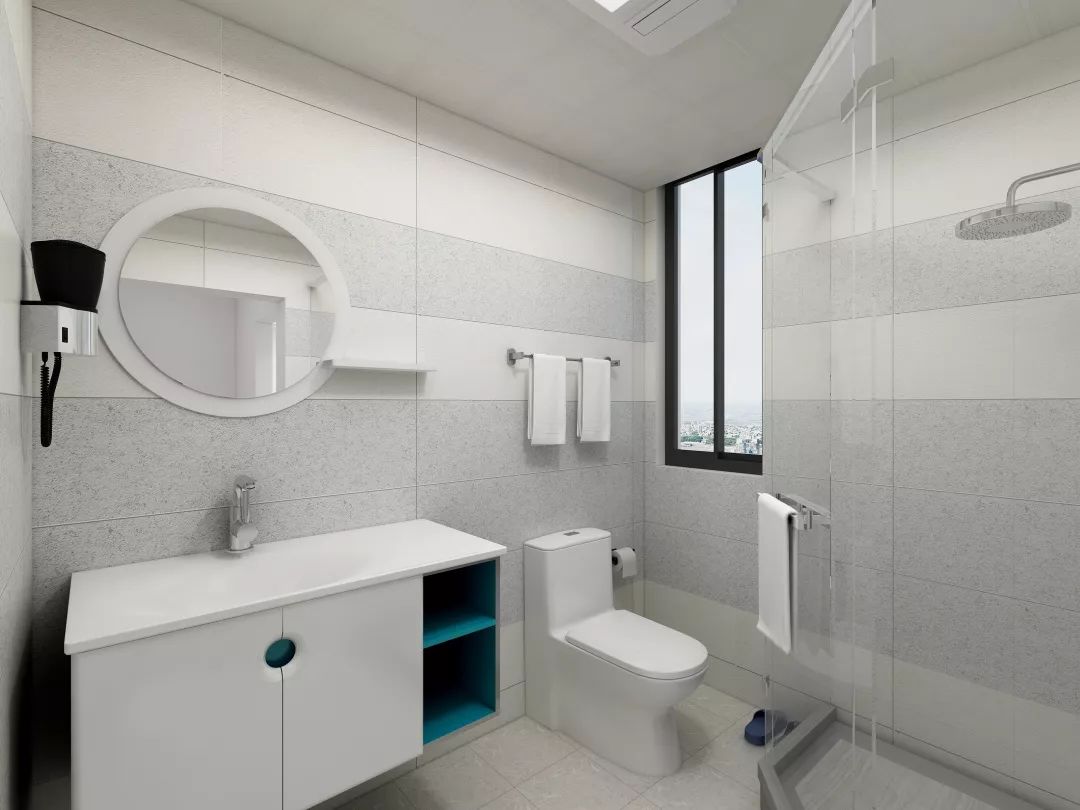 卫生间的地面和墙面都选用了灰色格调的瓷砖,不仅简约时尚大气、更耐脏实用。干湿分离中间设置透明的玻璃隔断,把干湿分离做到位,椭圆形的白色梳妆镜让室内看起来大气美观。
