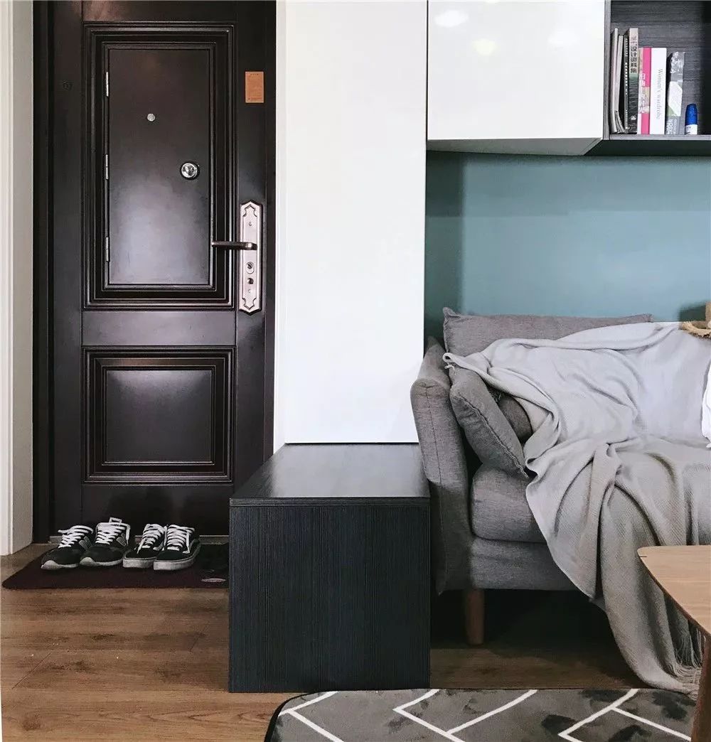 入户没有玄关走廊的户型,在入户门的侧方做上一个换鞋凳,底部可以摆放日常更换的鞋子,十分方便,将其与客厅联通,让整个空间更加宽敞。