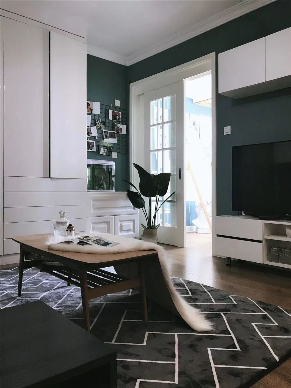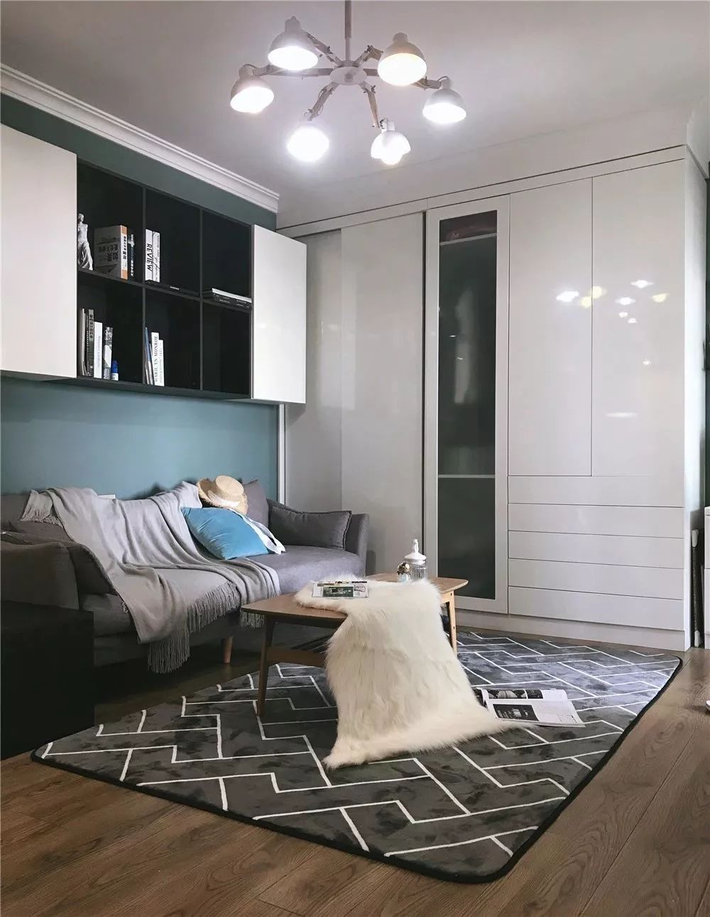 客厅是用无数收纳空间打造而成,沙发搭配复古色调的背景墙,显得更有格调感一些。舒适的地毯+毛毯摆设,也让客厅多出一些轻奢感。