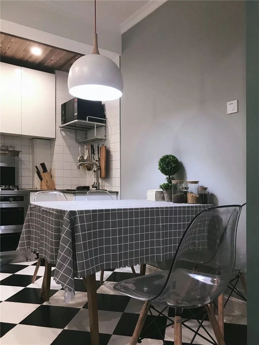 餐厅的地面铺贴了黑白色的地砖,构造了现代时尚的感觉。透明的餐椅搭配时尚吊灯,让空间看起来更加通透,温馨十足。