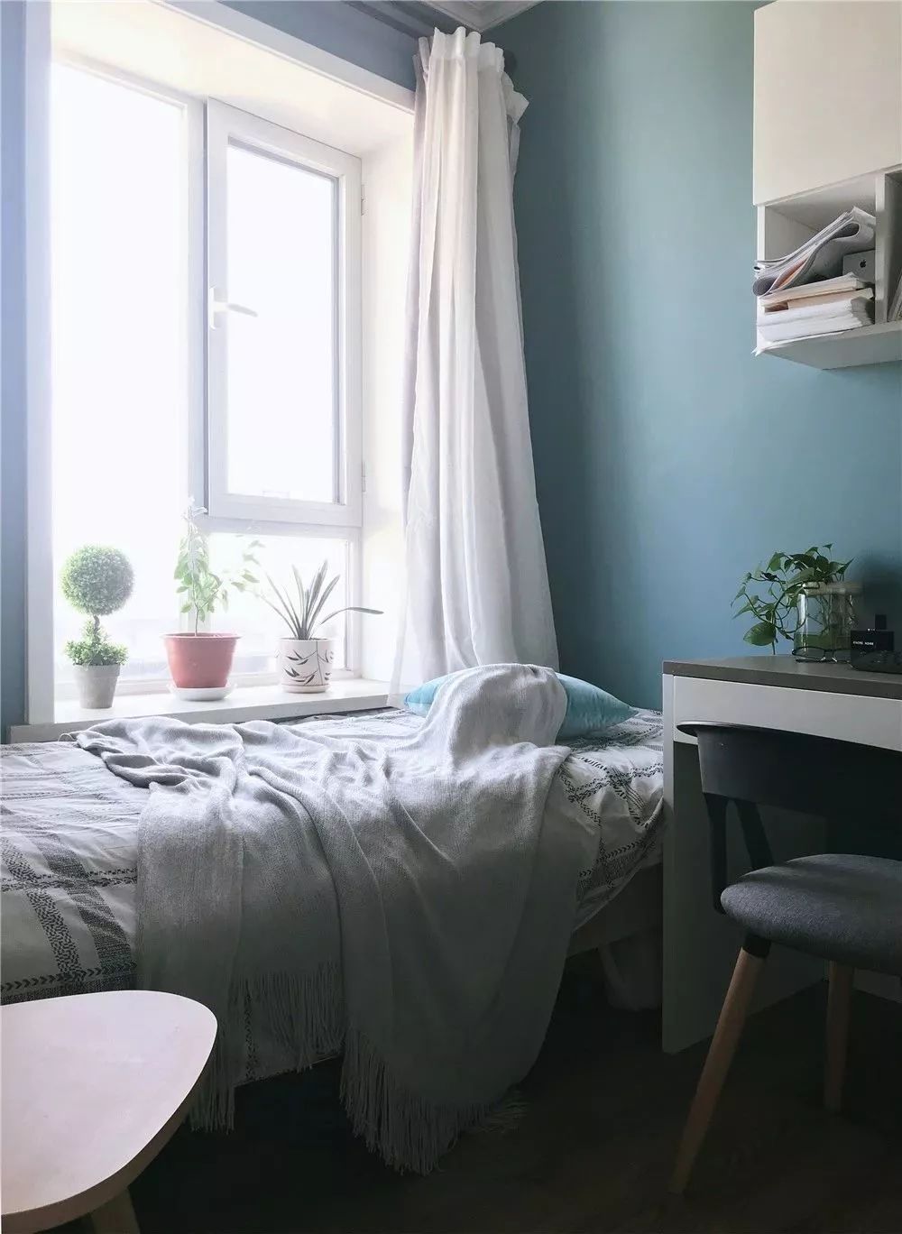 次卧的床选择了靠着窗户摆放,留出更多的面积来做书桌和衣柜,同样在窗台上摆放一些绿植,让空间更加惬意舒适。