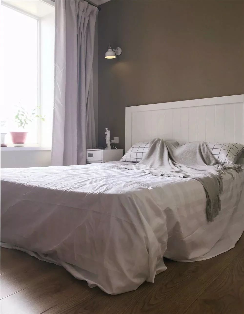 主卧的墙面被刷成了浅咖灰色,搭配白色的床品,看起来简单而又舒适。再摆上绿植,清新自然,心旷神怡。