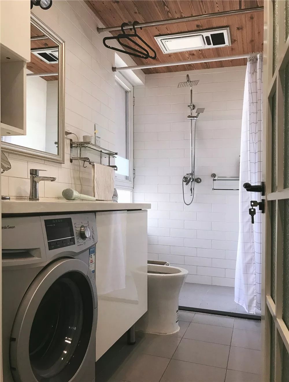 卫生间比较宽敞,一字形排列的洗手台、马桶和淋浴区,洗衣机也被放在了洗手台的下方,用浴帘做干湿分离,简约又实用。