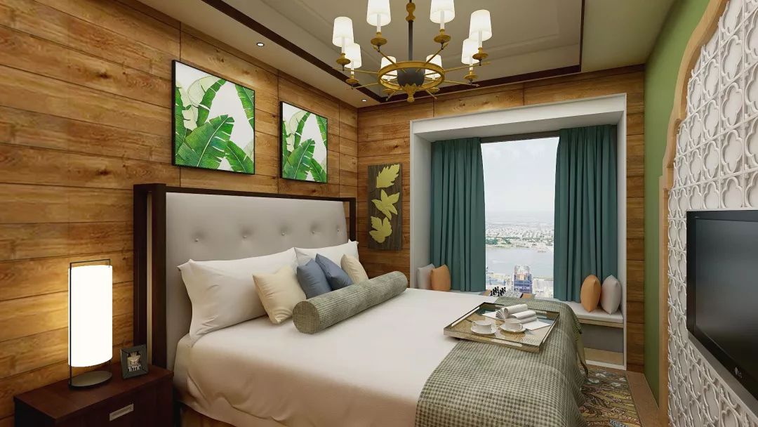 卧室的飘窗,风景相当的好,当初业主选择这个户型就是为着这窗外的风景妥协的。窗内以原木搭配为主,给人的第一感觉就是温馨,窗外的景色繁华,这不就正是我们对家的追求和向往。